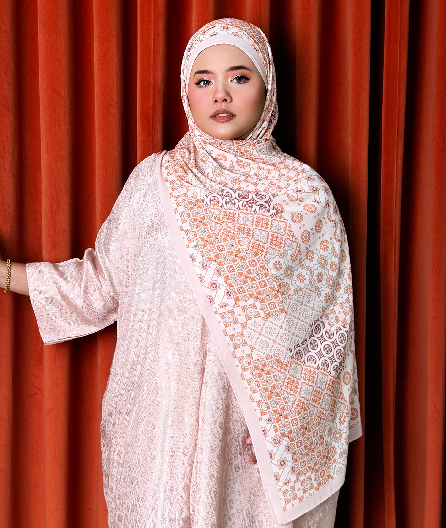 Crafted from our signature 2-metre Korean chiffon, each shawl drapes beautifully, feels lightweight and cooling, and styles effortlessly for long days of celebration. The intricate pattern adds depth without overpowering your outfit — a subtle statement that elevates any Raya ensemble.